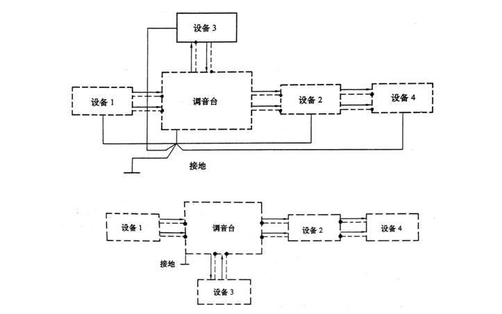 每一臺設備與調音臺連接,只允許有一根導線的屏蔽層的兩端與設備外殼相連,其他所有與調音臺連接的導線的屏蔽層均以與調音臺連接的一端與調音臺外殼相連,另一端懸空。其他設備之間的連接同樣只允許有一根導線的屏蔽層的兩端與設備外殼相連,其他導線的屏蔽層一端接外殼一端懸空。整個系統選擇調音臺輸人端附近的一點接大地。鏈式連接連接的設備不宜太多,否則將會發生明顯的地阻干擾。